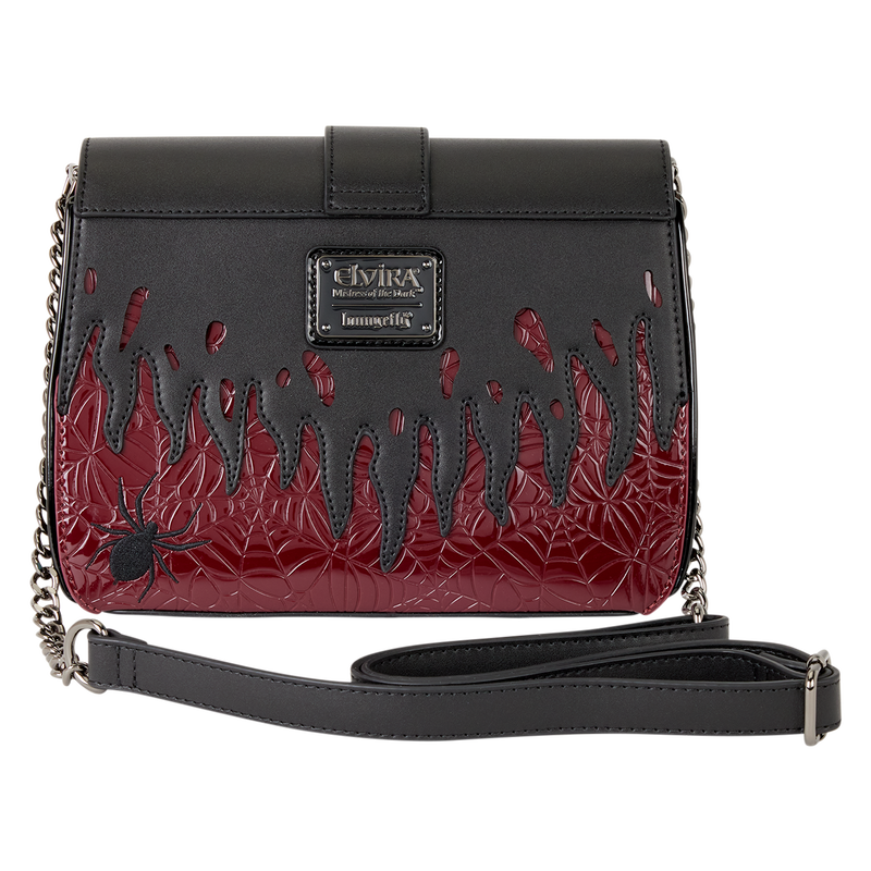 This faux leather crossbody features red flames that have debossed spider webs within it. You’ll find embroidery of spiders and Elvira’s name on the front and back of the bag. A black strap extends down the front, featuring a molded metal charm of a dagger and a spider!